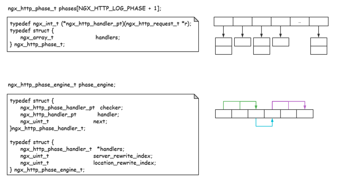 不同的阶段下面链接了多个方法(C函数),说明不同的阶段可以用不同的方法处理;这些方法又构成了一条责任链