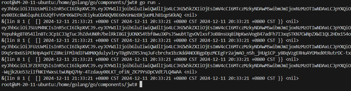 func main() { data := &jwts.Data{ Name: "lin", Age: 8, Gender: 1, RegisteredClaims: jwt.RegisteredClaims{ ExpiresAt: jwt.NewNumericDate(time.Now().Add(time.Hour)), IssuedAt: jwt.NewNumericDate(time.Now()), NotBefore: jwt.NewNumericDate(time.Now()), }, } var err error var sign string outData := &jwts.Data{}