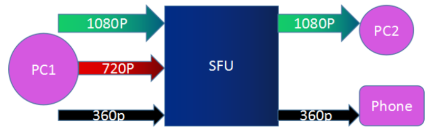 - 是指视频的共享者可以同时向SFU发送多路不同视频分辨率的视频流,而sfu可以将接收到的三路流根据各终端的情况而选择其中某一路发送出去。Simulcast模式对移动端的终端类型非常有用,它可以灵活而又智能地适应不同的网络环境。