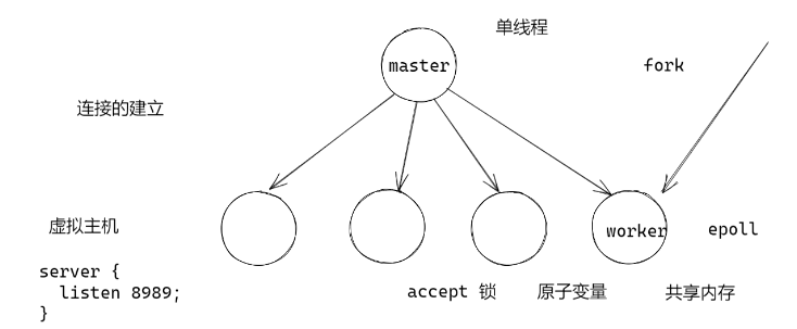 然后fork出许多worker线程,每个worker线程对应可能有多个server(即虚拟主机,监听端口)